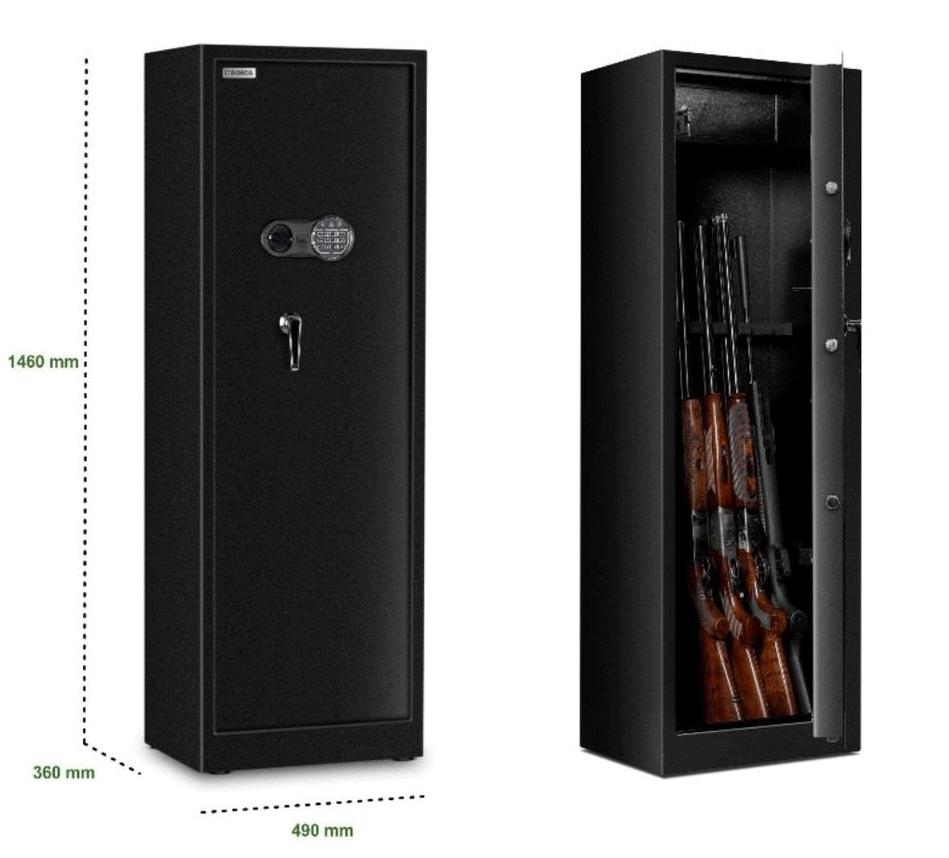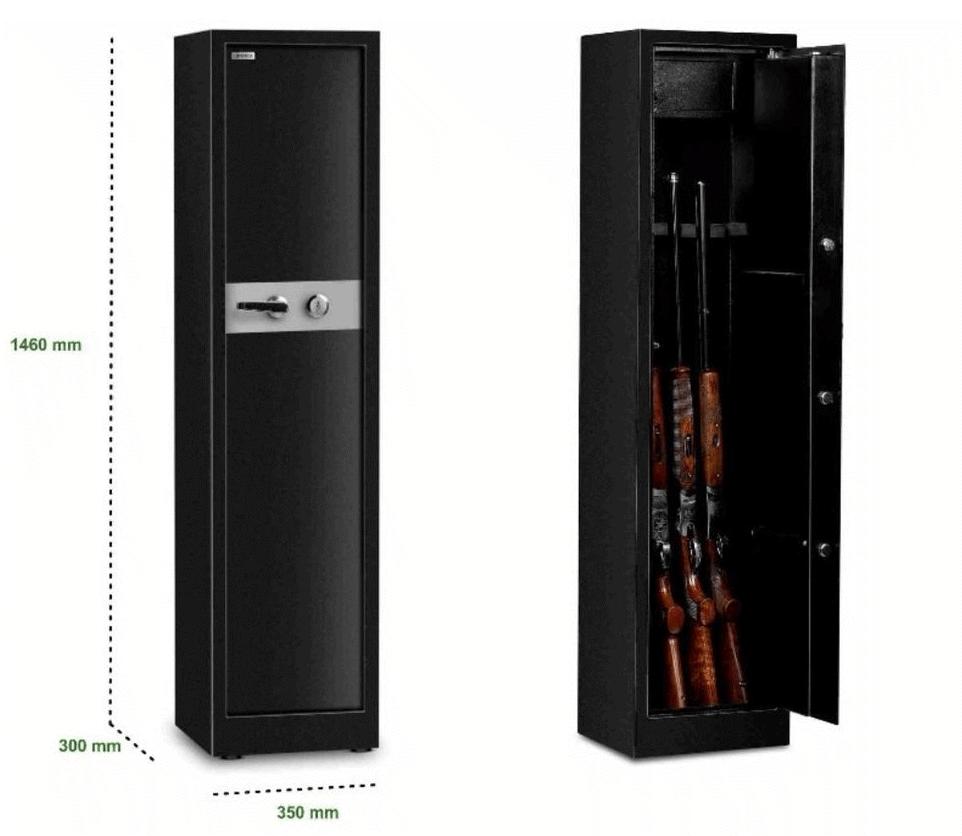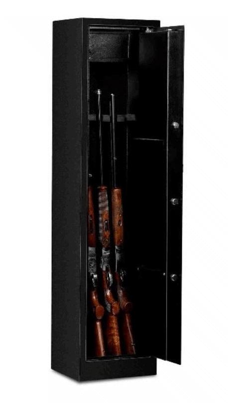 Caja fuerte para cinco armas. Puerta con llave, con 5 pernos de seguridad de 25 mm de diámetro. Interior con secreter con juego de llaves (2 copias). Posee juego de llaves (2 copias).